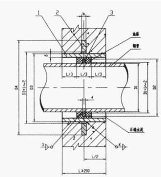 4 、套管穿墻處之墻壁,如遇非混凝土墻壁時(shí)應(yīng)改用混凝土墻壁,其澆注混凝土范圍,Ⅱ型套管應(yīng)比翼環(huán)直徑(D4 )大200mm ,而且必須將套管一次澆固于墻內(nèi)。套管內(nèi)的填料應(yīng)緊密搗實(shí)。